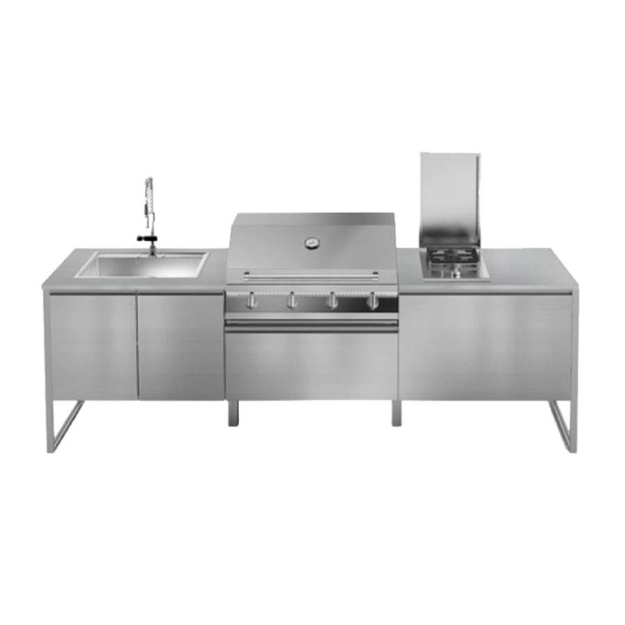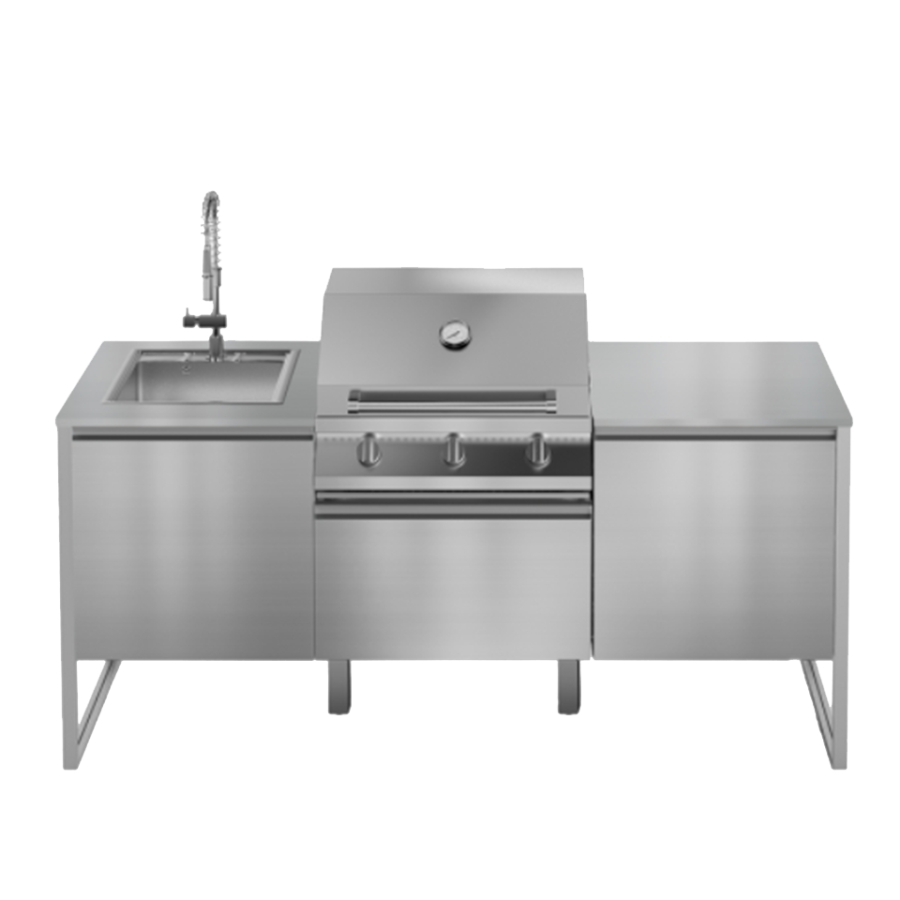 Saklama dolabı ve çalışma tezgahı, 90 cm barbekü ünitesi, entegre eviye sistemi ile genişlik 2,80 cm, derinlik 70 cm olan kompakt açık hava mutfağıdır.