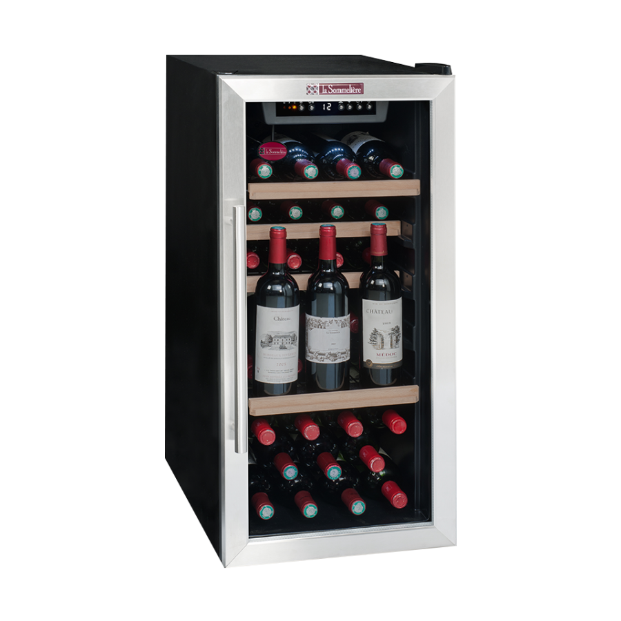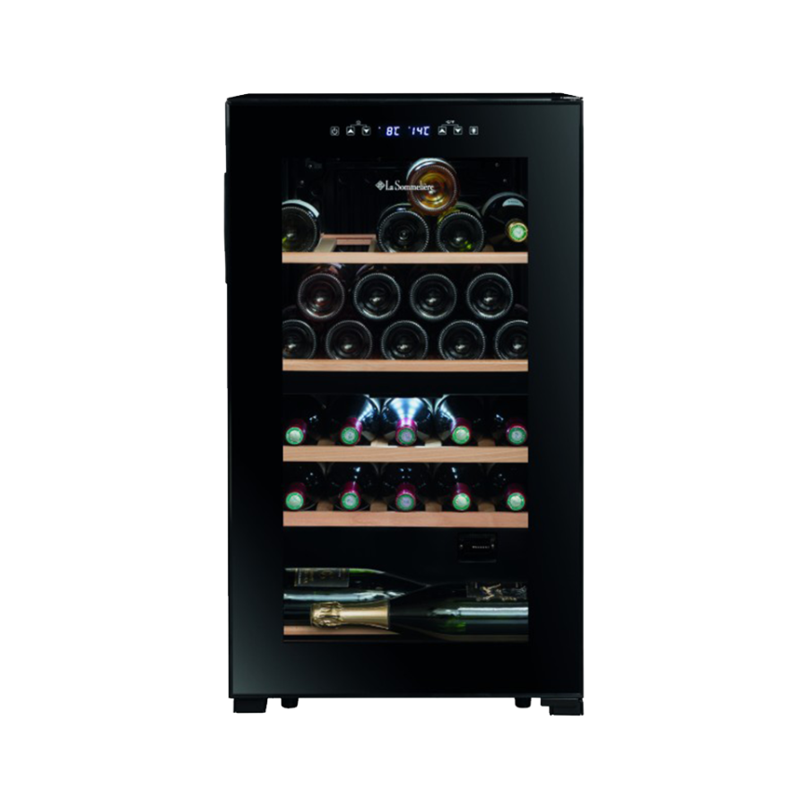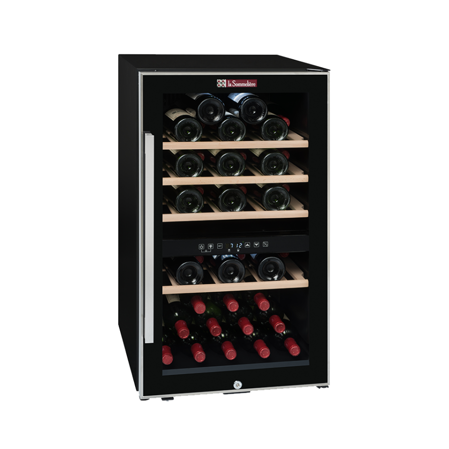 32 şişe kapasiteli, bağımsız ısı ayarı yapılabilen çift bölme, dolap içi led aydınlatmaya sahip solo şarap dolabı.