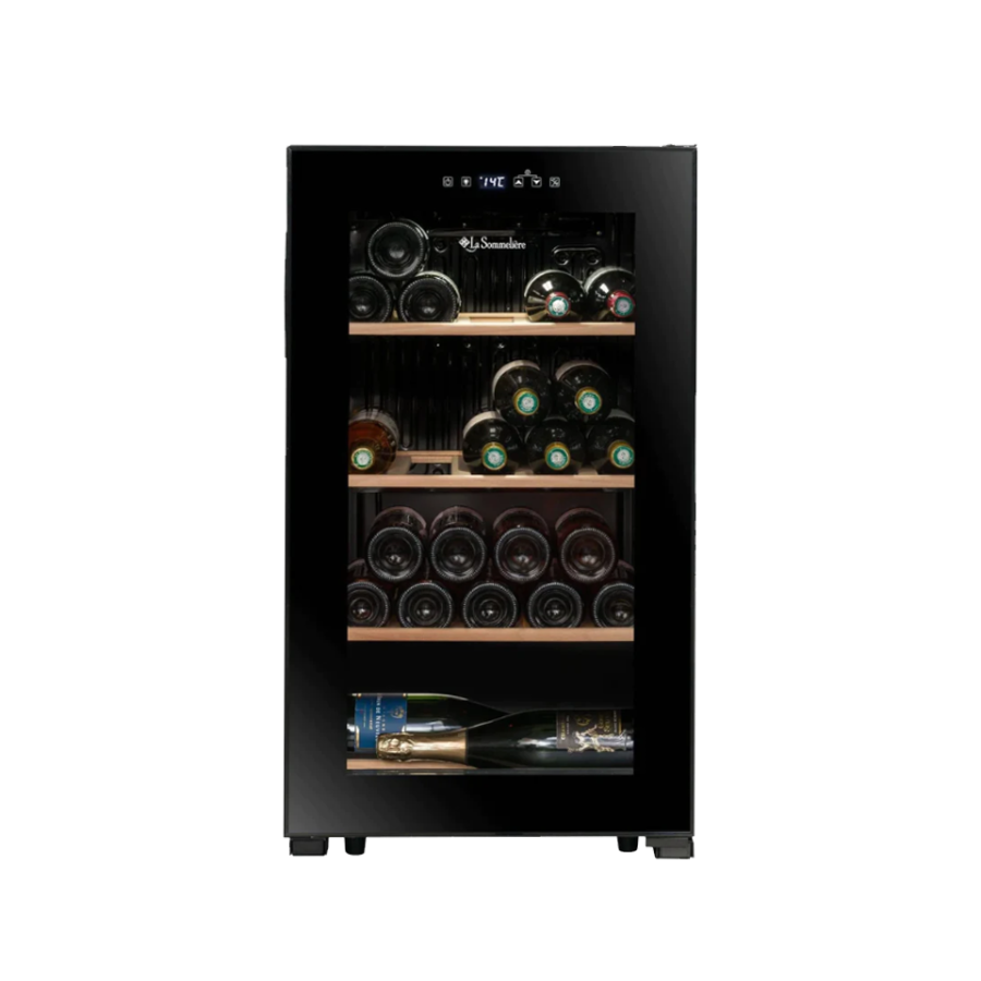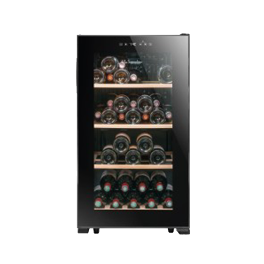 51 şişe kapasiteli, tek bölme, ısı ayarı yapılabilen, anti UV cam kapılı şarap saklama dolabı.