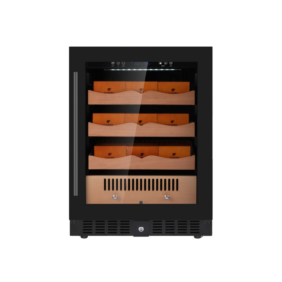 250 puro kapasiteli, dijital sıcaklık ve nem ölçer göstergeli, ayarlanabilir nem seviyeli puro saklama dolabı.